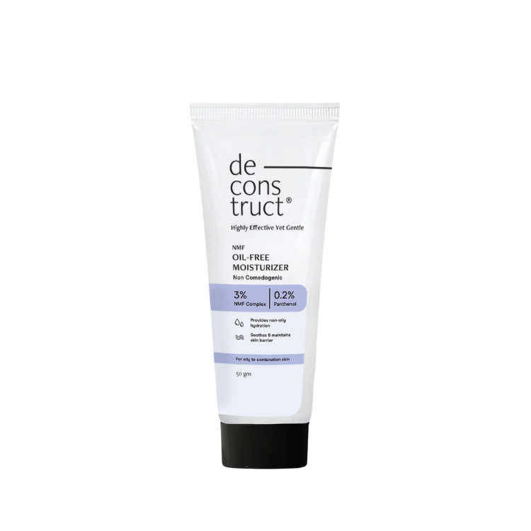 De Cons Truct Oil-Free Moisturizer is a lightweight, oil-free moisturizer is powered with 3% NMF Complex and Panthenol to deliver up to 72-hour hydration without clogging pores. It soothes, calms, and restores the skin barrier, making it ideal for oily, acne-prone, and sensitive skin. The non-comedogenic, non-sticky formula is quickly absorbed, leaving the skin feeling fresh and balanced throughout the day. De Cons Truct Oil-Free Moisturizer contains no added fragrance, parabens, or alcohol, ensuring a gentle experience.